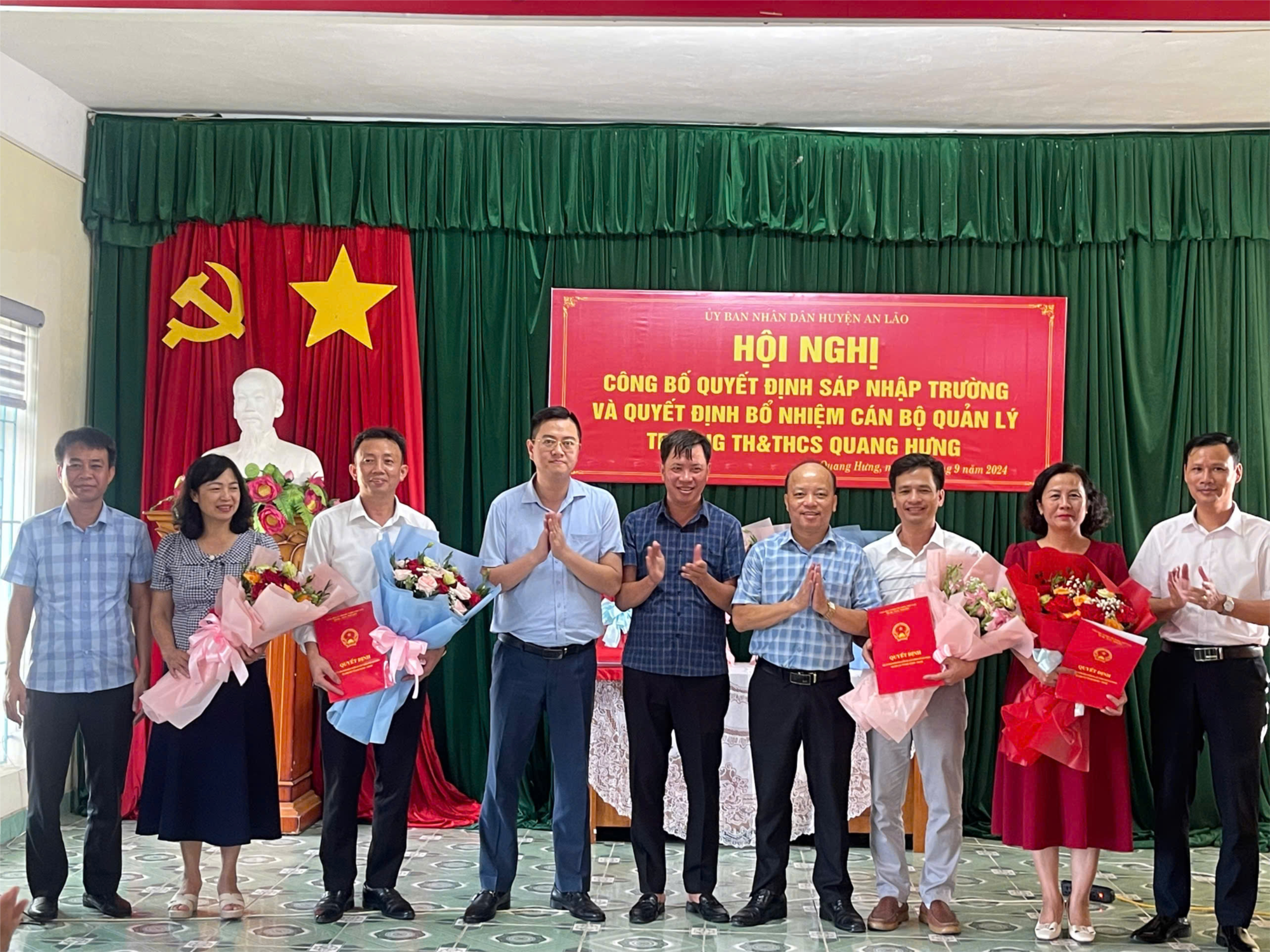 Chiều ngày 30 tháng 9 năm 2024 tại Hội trường trường THCS Quang Hưng đoàn công tác của UBND huyện An Lão tiến hành Hội nghị công bố Quyết định sáp nhập trường Tiểu học Quang Hưng và trường THCS Quang Hưng; Quyết định bổ nhiệm các chức danh lãnh đạo quản lý nhà trường gồm có: