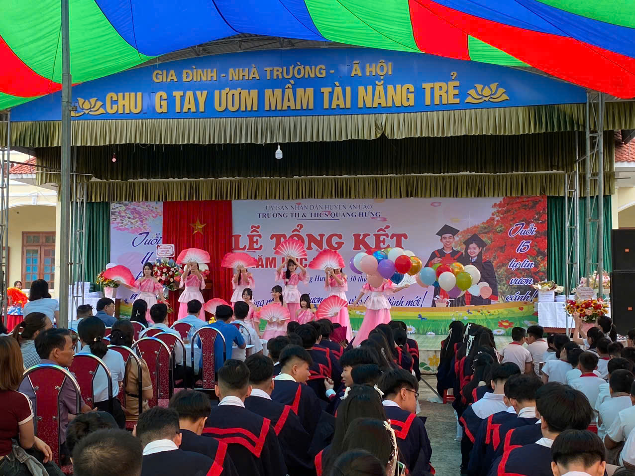 Sáng ngày 30/5/2025 Trường TH&THCS Quang Hưng đã long trọng tổ chức Lễ tổng kết năm học 2024-2025. Tại lễ tổng kết BGH cùng Ban đại diện cha mẹ học sinh nhà trường đã trao tặng giấy khen và phần thưởng cho 467 em HS đạt danh hiệu Học sinh xuất sắc, Học sinh giỏi cấp trường; 43 em đạt danh hiệu học sinh giỏi cấp huyện và thành phố. Cùng các thầy cô giáo có thành tích trong việc phát hiện và bồi dưỡng học sinh giỏi. Làm lễ bế giảng cho 107 học sinh khối 9 và chuyển cấp cho 123 học sinh khối 5, bàn giao 1008 Đội viên, Thanh niên về địa phương sinh hoạt hè.