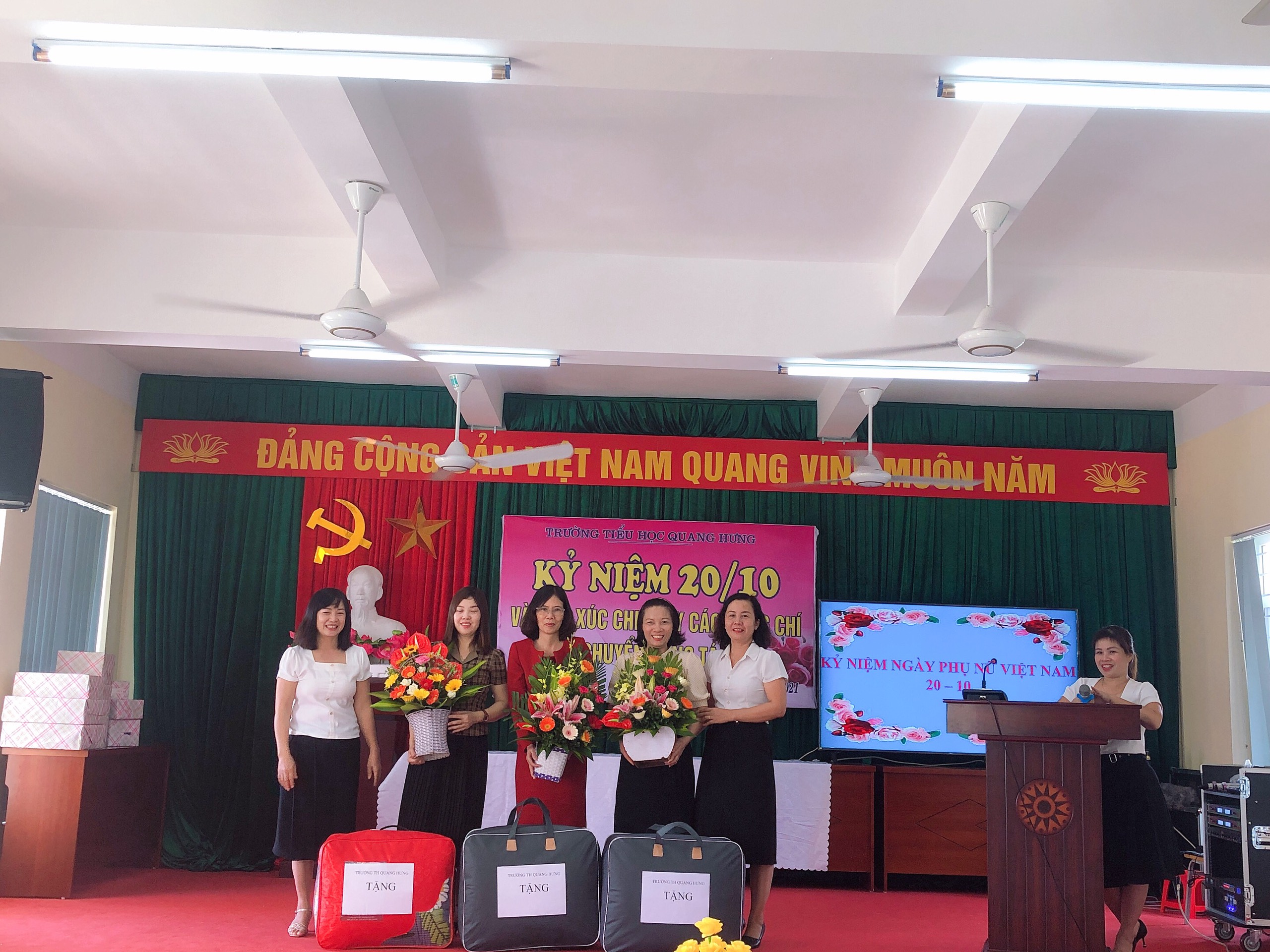 Ngày 20/10, trường TH Quang Hưng long trọng tổ chức kỉ niêm ngày phụ nữ Việt nam (20/10).Trong không khí vui tươi, phấn khởi, đồng chí chủ tịch công đoàn nhà trường ôn lại ý nghĩa của ngày phụ nữ Việt nam 20/10.Đ/c BTCB- HT nhà trường lên tổng kết lại những kết quả mà trong năm học qua các chị em đã gặt hái được. Tuy còn gặp nhiều khó khăn nhưng với tinh thần yêu nghề , mến trẻ, cùng với tinh thần đoàn kết các chị em trong trường TH quang Hưng sẽ luôn là những người phụ nữ giỏi việc trường, đảm việc nhà và chắc chắn trong năm học này sẽ gặt hái được nhiều thành công tôt đẹp !