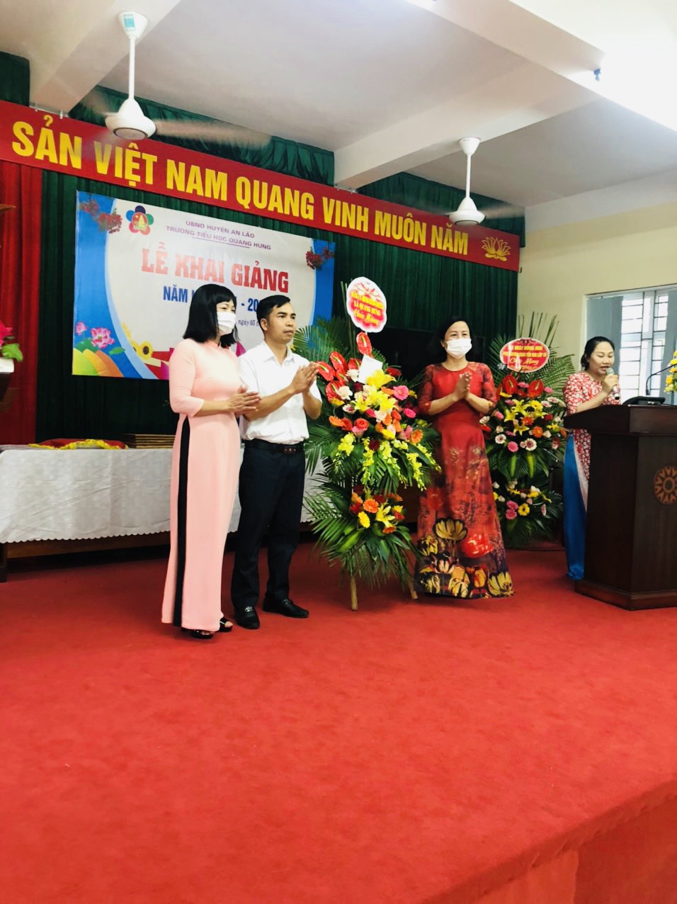 Mới sáng ngày ra, mưa như trút nước nhưng các em học sinh lớp 1 vẫn háo hức được bố, mẹ đưa đến trường dự lễ khai giảng năm học mới. Để đảm bảo tốt công tác phòng chống dịch nên các em học sinh khối 2,3,4,5 dự lễ khai giảng trực tuyến ở nhà. Các em học sinh lớp 1 được các thầy cô đón ngay ở cổng trường để đo thân nhiệt, sát khuẩn, đón các em vào trường dự lễ khai giảng năm học mới. Buổi lễ khai giảng năm nay diễn ra thật ngắn gọn nhưng vẫn được tổ chức long trọng với đầy đủ các nghi thức .Cả trường thật xúc động lắng nghe thư Bác Hồ, thư chủ tịch nước gửi các thầy giáo, cô giáo , các em học sinh nhân ngày khai giảng năm học mới. Bài diễn văn ngắn gọn, đầy súc tích của cô hiệu trưởng đã nêu bật nên các thành tích của thầy và trò trường Tiểu học Quang Hưng trong năm học 2020-2021. Bài diễn văn vừa dứt, một hồi trỗng trường vang lên báo hiệu năm học mới bắt đầu- một năm học đầy khó khăn, vừa dạy- học vừa phải đảm bảo công tác phòng chống dịch nhưng với tinh thần đoàn kết, sự cố gắng nỗ lực của các thầy cô và các em học sinh, chắc chắn rằng năm học này trường TH Quang Hưng sẽ tiếp tục gặt hái được nhiều thành công hơn nữa.