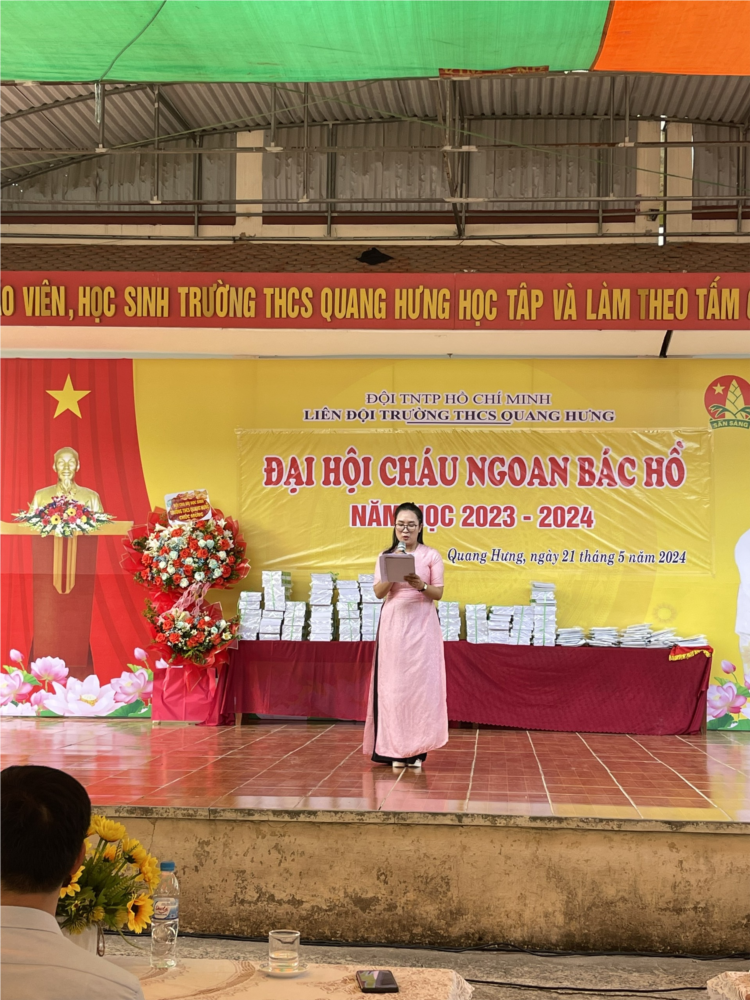 Thực hiện sự chỉ đạo của Hội đồng đội huyện An Lão, thực hiện nhiệm vụ năm học 2023-2024 trường THCS Quang Hưng; được sự chỉ đạo của Chi bộ, BGH nhà trường, Chiều ngày 21 tháng 5 năm 2024 Liên đội trường THCS Quang Hưng đã tổ chức thành công Đại Hội cháu ngoan Bác Hồ, để báo công lên Bác Kính yêu và tổng kết phong trào hoạt động của Liên đội. Trong năm học vừa qua, kết quả học tập và rèn luyện cuối năm toàn liên đội: Khối 6,7,8 có 23 đội viên đạt danh hiệu HSXS, 106 đội viên là HSG, 214 đội viên CNBH và khối 9 có 61 bạn đạt HSG, 46 bạn HSTT. Trong cuộc thi HSG các cấp có 01 bạn đoạt giải Khuyến khích cấp quốc gia cuộc thi ATGT; 08 bạn đoạt giải trong các cuộc thi cấp thành phố gồm: ( 02 bạn đoạt giải Ba, và giải khuyến khích môn Lịch sử, 01 bạn đoạt gải KK môn GDCD, 01 bạn đoạt giải KK cây đàn tuổi thơ; 02 bạn đoạt giải Tư cuộc thi KHKT, 02 bạn đoạt giải KK môn TDTT); 20 bạn đoạt giải cấp huyện (02 giải Toán bằng tiếng Anh ( 01 giải Ba, 01 KK) , 02 giải KHKT (01 giải Nhì, 01 giải Tư) x 2 HS/giải, 01 giải Ba cuộc thi Sơn ca và 14 bạn đoạt giải HSG các môn Văn hóa (2 Nhất, 2 Nhì, 5 Ba, 5 KK). Nhà trường và Hội cha mẹ học sinh đã khen thưởng động viên cho các bạn đội viên có thành tích cao trong học tập và rèn luyện. Các bạn là những bông hoa tươi thắm nhất của liên đội THCS Quang Hưng, xứng đáng là con ngoan, trò giỏi, cháu ngoan Bác Hồ.