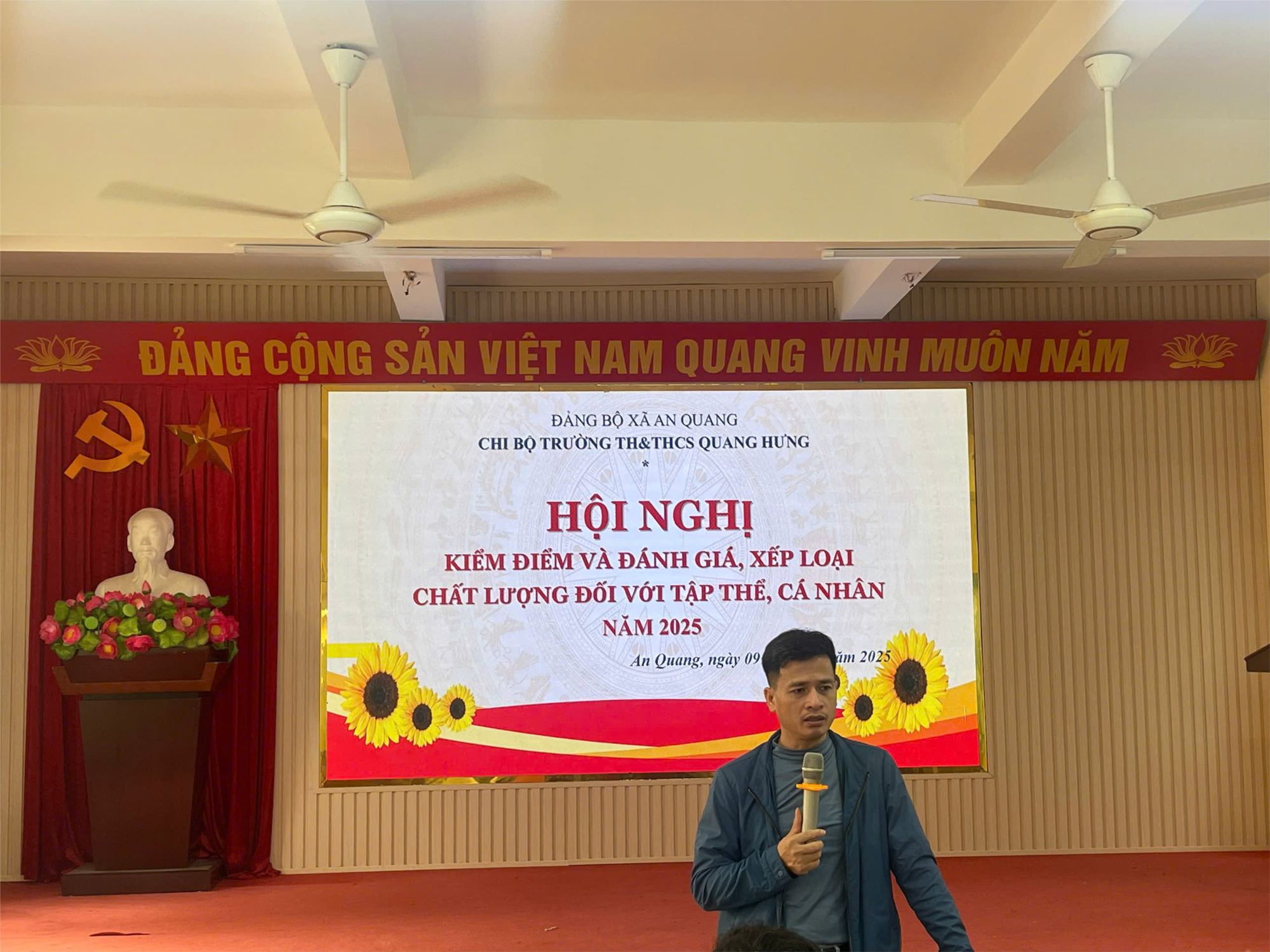 Thực hiện kế hoạch số 36-KH/ĐU ngày 28/11/2025 của Đảng ủy xã An Quang v/v kiểm điểm và đánh giá, xếp loại chất lượng đối với tập thể, cá nhân trong hệ thống chính trị, Ngày 09/12/2025chi bộ Chi bộ trường TH&THCS Quang Hưng tổ chức Hội nghị kiểm điểm, đánh giá và và xếp loại chất lượng tổ chức Đảng, đảng viên và cán bộ lãnh đạo, quản lý năm 2025.