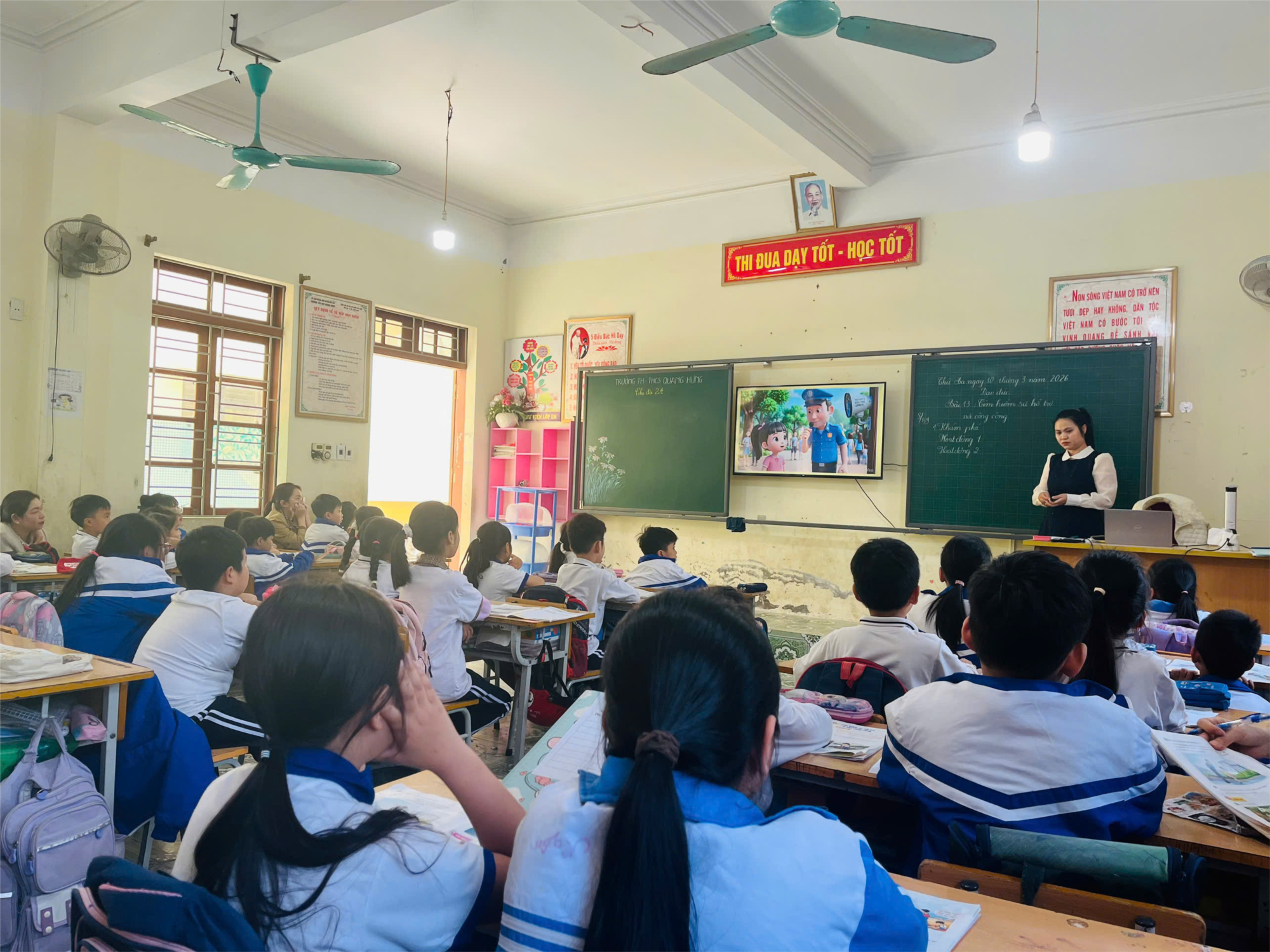 Mở đầu tiết dạy, cô - trò cùng nhau tham gia trò chơi tạo hứng thú cho tiết học, vừa là để các em nhớ lại kiến thức đã được học ở tiết trước. Trong tiết học, cô giáo đã khéo léo lồng ghép các yếu tố giáo dục địa phương, an toàn giao thông, kết hợp với các nội dung về quốc phòng an ninh, công dân số. Các em học sinh đã tích cực tham gia thảo luận và chia sẻ những tình huống cụ thể, tạo nên một không khí lớp học sôi nổi, đầy hứng thú. Các thầy cô đã theo dõi, quan sát và ghi nhận những điểm đổi mới trong cách tổ chức dạy học của giáo viên.