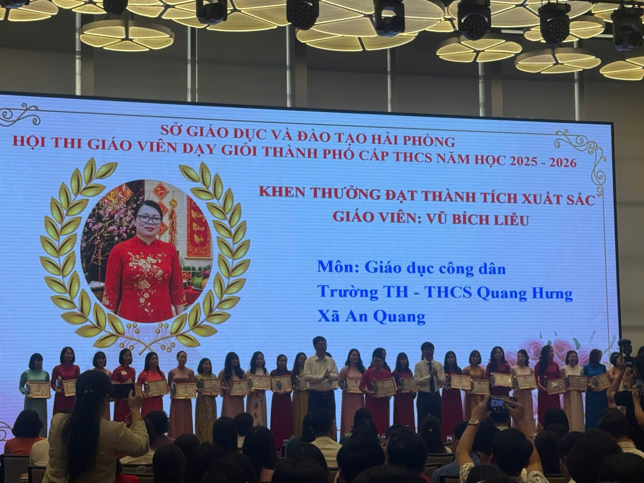 Cô giáo Vũ Bích Liễu – Môn Giáo dục công dân: Đặc biệt vinh dự khi hình ảnh của cô được trình chiếu trang trọng trên màn hình lớn của hội nghị với dòng chữ "Khen thưởng đạt thành tích xuất sắc".