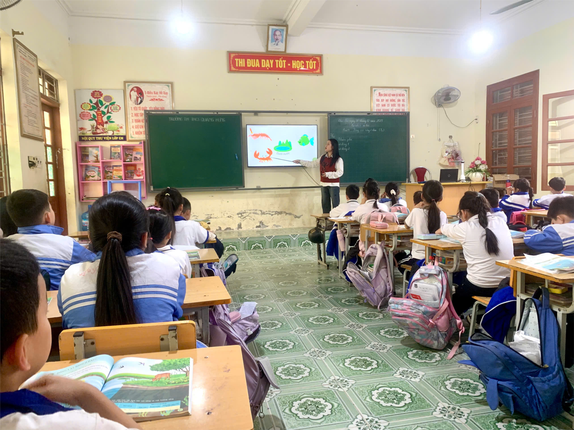 Trong tiết Tự nhiên xã hội: Bài 17: Động vật sống ở đâu? do cô giáo Phạm Thu Thùy thể hiện đã vận dụng linh hoạt các phương pháp, hình thức tổ chức dạy học đặc biệt là việc sử dụng công nghệ thông tin, trí tuệ nhân tạo vào giảng dạy. Từ các hình ảnh minh họa sinh động, hoạt động quan sát, thảo luận và trả lời câu hỏi, các em bước đầu nhận biết được tên gọi của động vật với nơi chúng sinh sống. Sau tiết học các em được biết môi trường sống của một số loài động vật quen thuộc như động vật sống trên cạn, dưới nước và động vật vừa sống trên cạn vừa sống dưới nước. Bài học giúp học sinh mở rộng hiểu biết về thế giới tự nhiên, hình thành ý thức yêu quý, bảo vệ động vật và môi trường sống xung quanh. Các em tham gia học tập tích cực, hào hứng và vận dụng tốt kiến thức đã học vào thực tế cuộc sống hằng ngày.