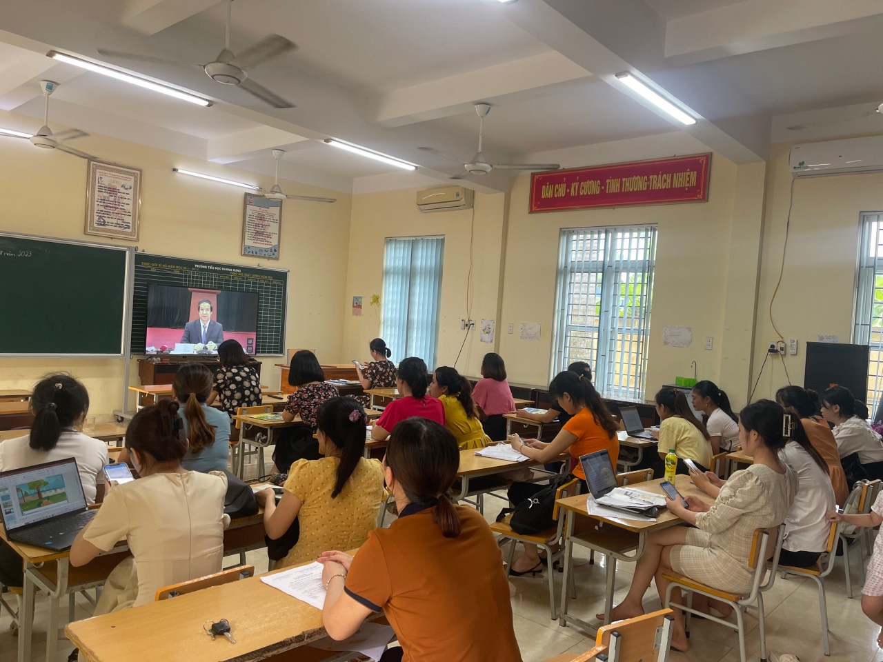 Sáng 15/8/2023, tập thể CB - GV - NV trường Tiểu học Quang Hưng đã tham gia gặp gỡ Bộ trưởng Bộ Giáo dục Đào tạo qua hình thức trực tuyến chương trình "Bộ trưởng gặp gỡ nhà giáo, cán bộ quản lí, nhân viên ngành Giáo dục, Đào tạo năm 2023" do Bộ Giáo dục và Đào tạo tổ chức.