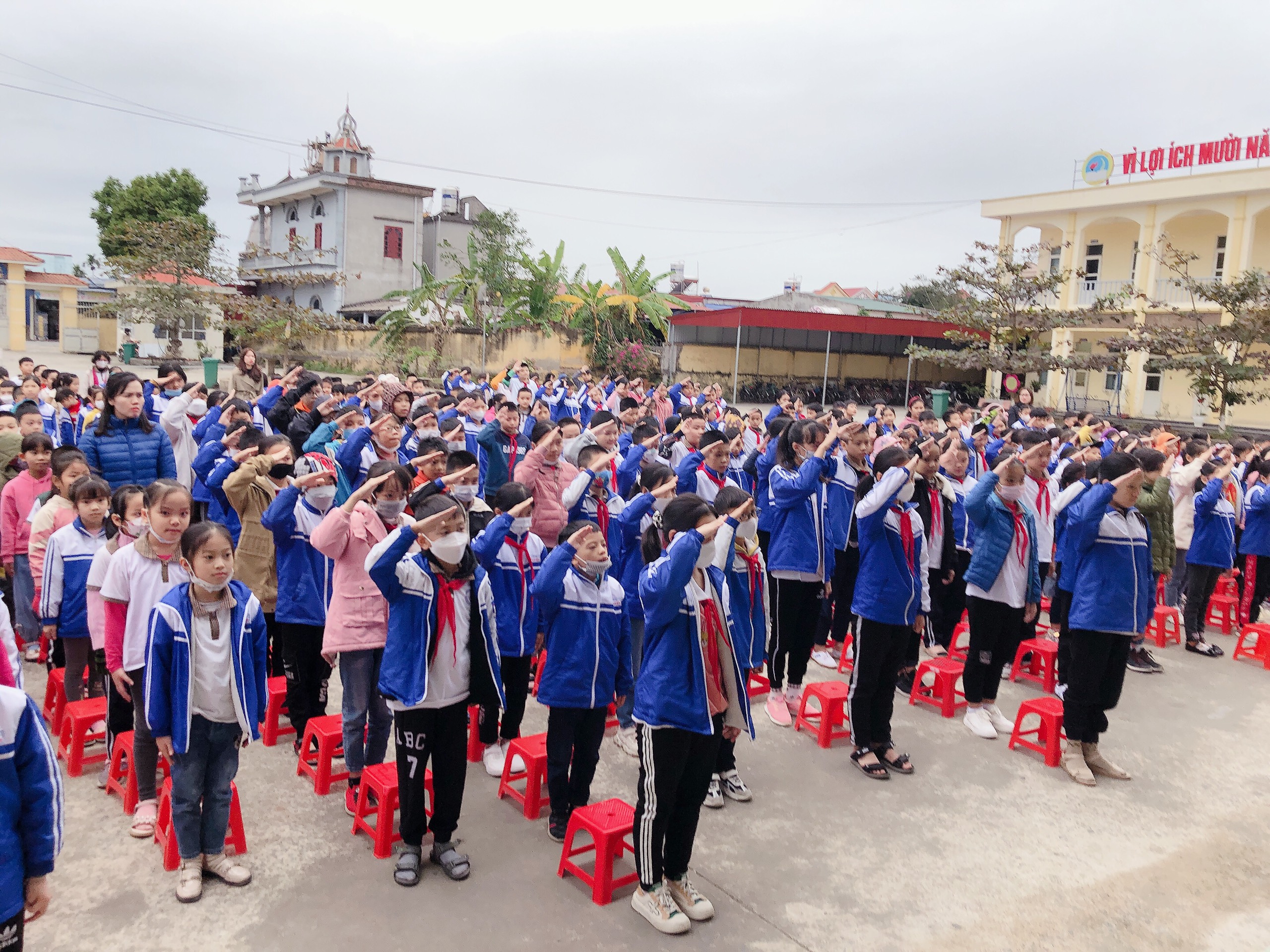 Cũng trong tiết chào cờ, các em được nghe cô Hiệu trưởng Vũ Minh Hồng biểu dương những tập thể, cá nhân đạt được những thành tích tốt trong tháng vừa qua và nhắc nhở, khích lệ các em tích cực học tập tốt noi gương anh bộ đội cụ hồ.