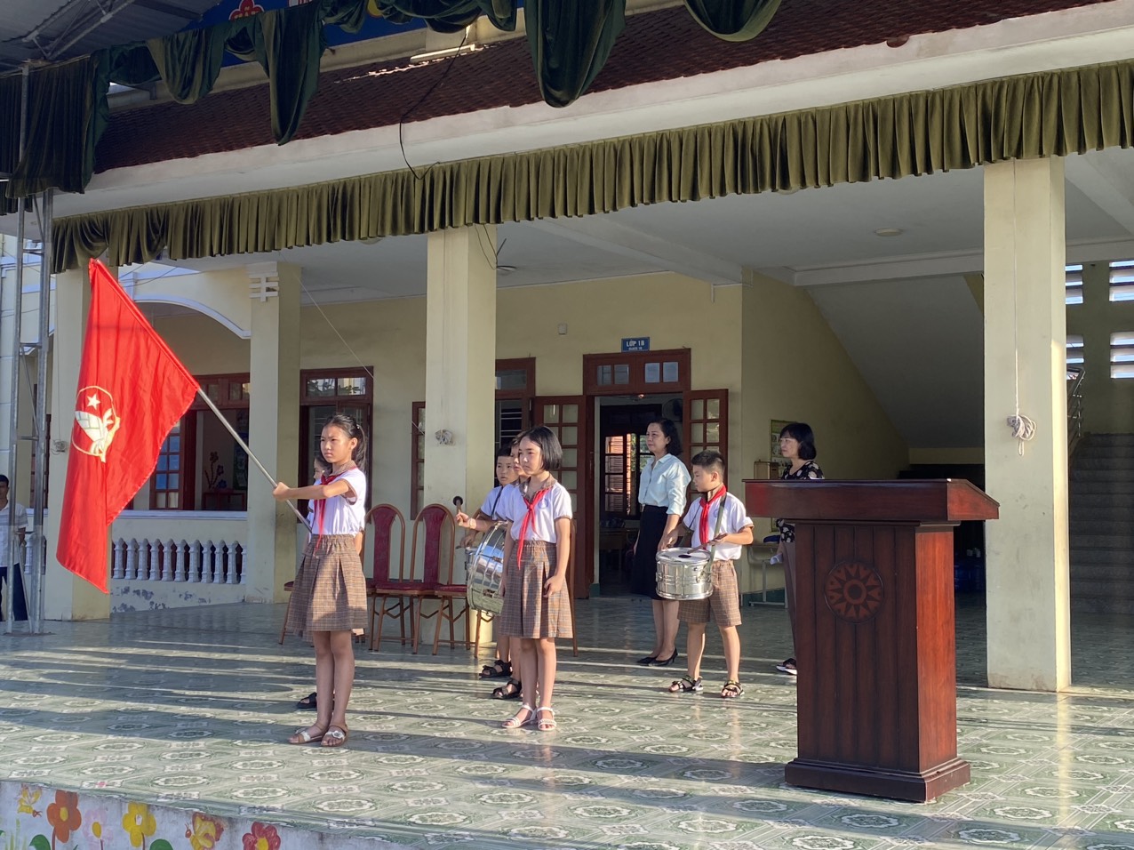 Sau nghi lễ chào cờ, hát Quốc ca, Đội ca thật nghiêm trang, cô Tổng phụ trách nhận xét về các hoạt động của các lớp trong tháng 9, thông báo kết quả thi đua của từng lớp, phổ biến triển khai các nội dung, kế hoạch tháng 10.